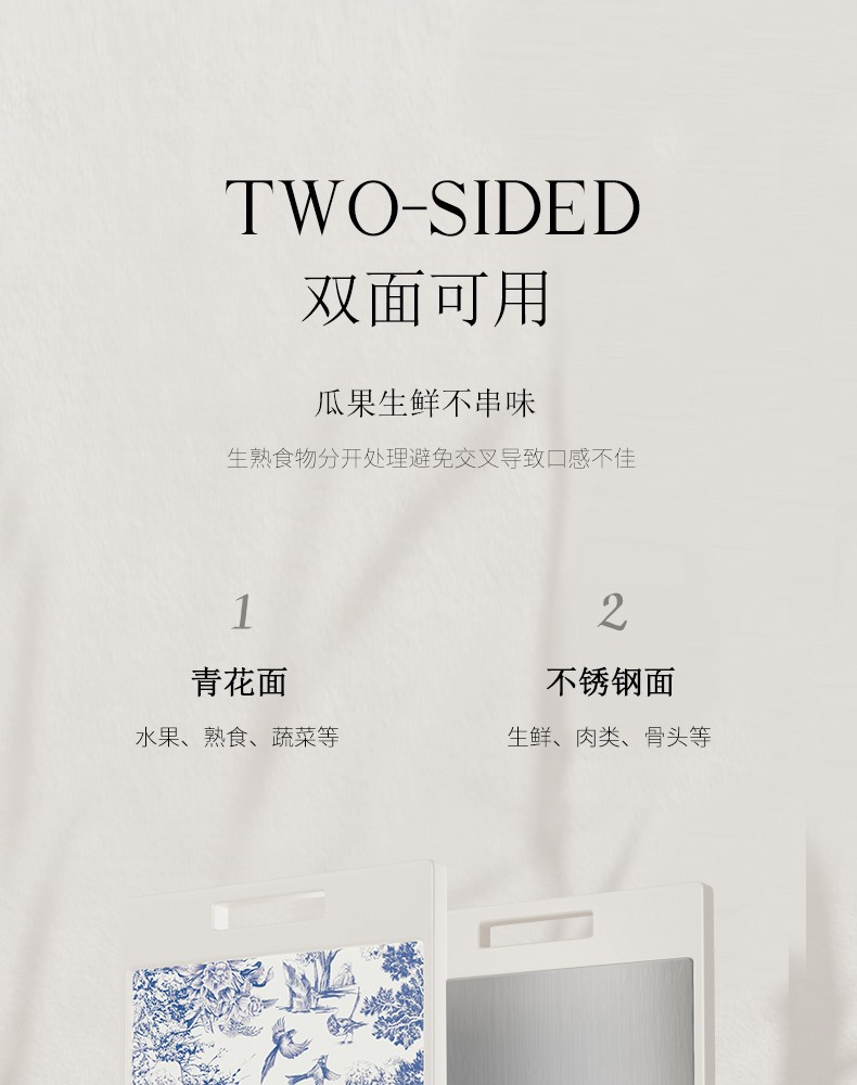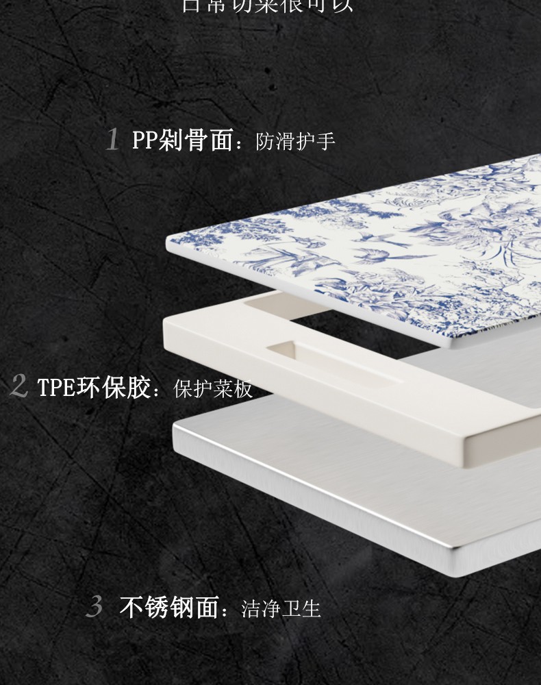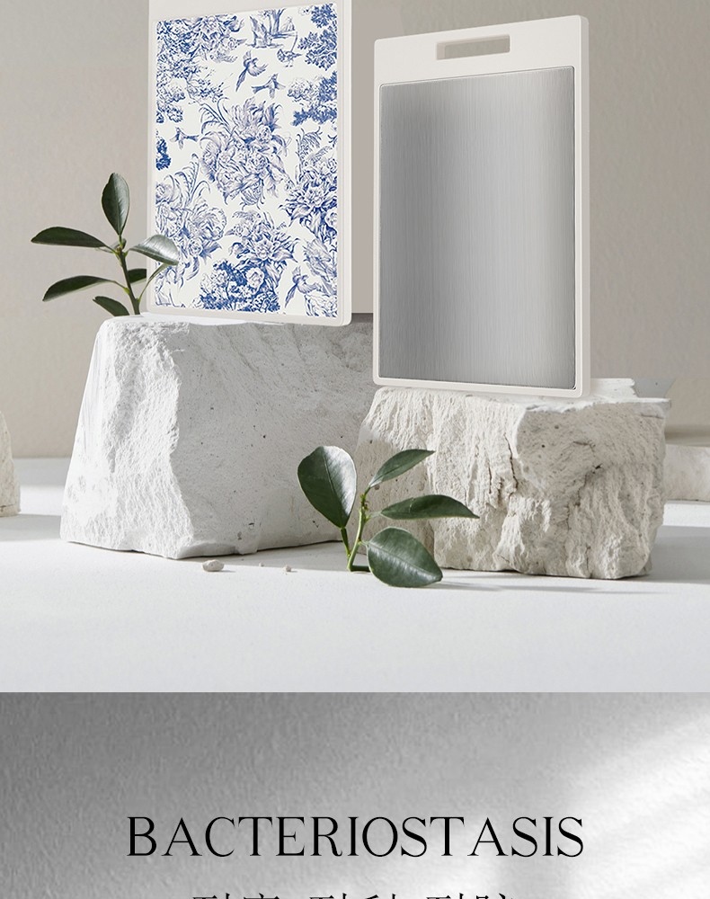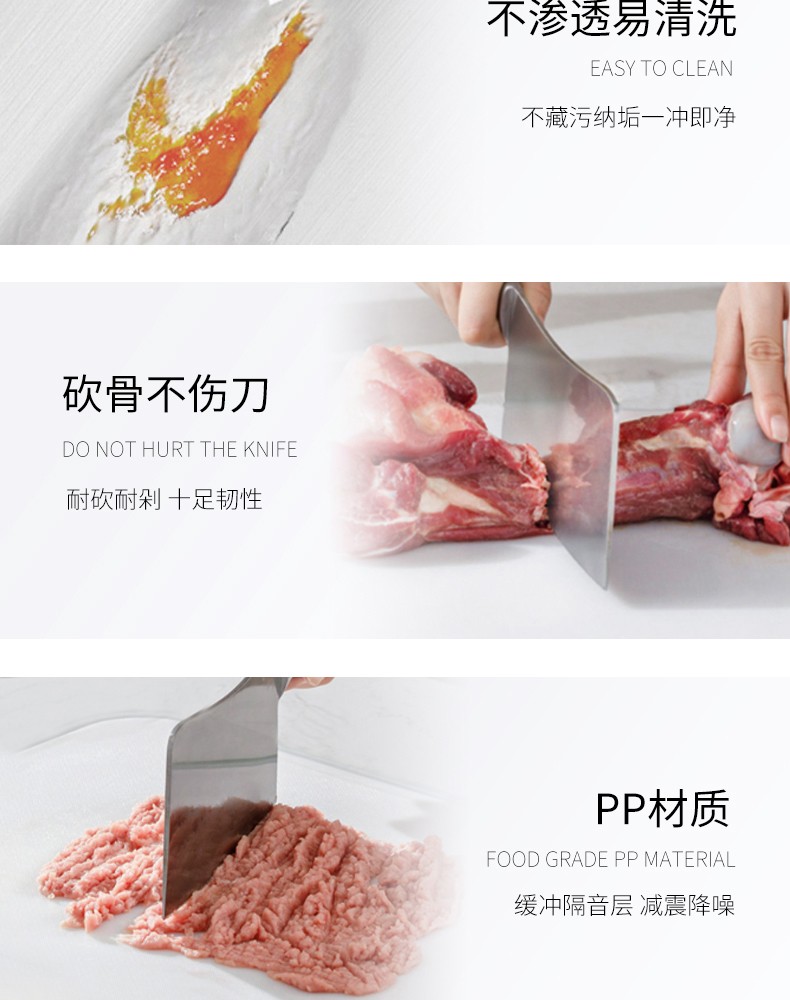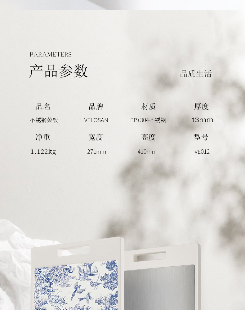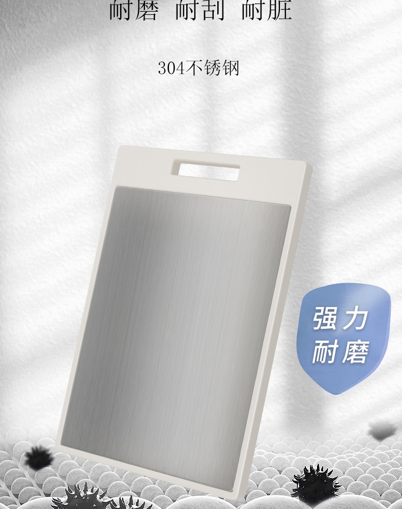 "1、双面使用,生熟分切,不混用防窜味; 2、抗菌不锈钢面,坚固耐磨; 3、抗菌PP面,切断防打滑; 4、不易粘连易清洁,不变黑不发霉; 5、把手可悬挂,快速沥干无水渍。 " "推荐理由:双面使用,生熟分切。 型号:VE012 SKU:VE01201 条码:6972547372916 材质:PP+不锈钢 颜色:银色 产品尺寸: 410*272*13mm 外箱尺寸: 475*330*75mm 装箱数/毛重:1台/箱,