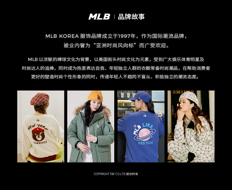 MLB诞生于1997年,以拥有150多年历史的美国职业棒球大联盟为创作蓝本,用复古印花图案作为灵感,创意呈现相关系列。MLB品牌以浓郁的棒球文化为背景,以美国街头时尚文化为元素,成为潮流运动领域的领导者——平均每6.3秒钟便售出一顶MLB CAP