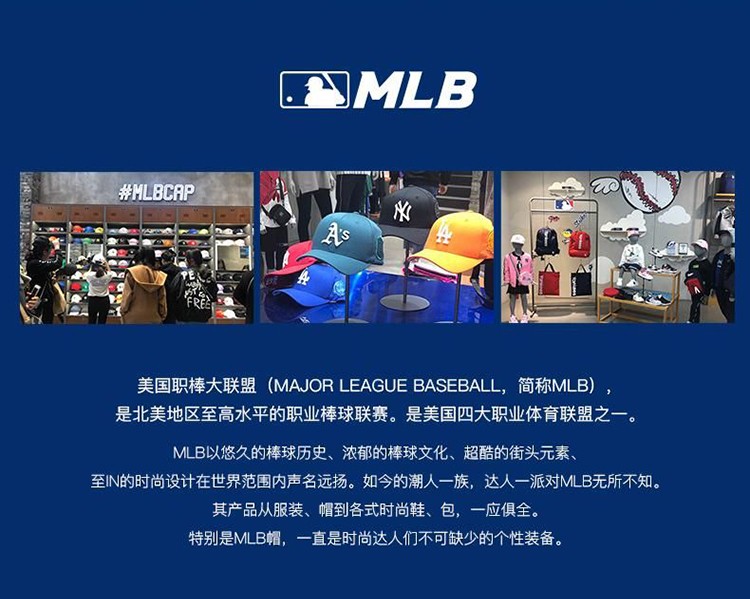 MLB诞生于1997年,以拥有150多年历史的美国职业棒球大联盟为创作蓝本,用复古印花图案作为灵感,创意呈现相关系列。MLB品牌以浓郁的棒球文化为背景,以美国街头时尚文化为元素,成为潮流运动领域的领导者——平均每6.3秒钟便售出一顶MLB CAP