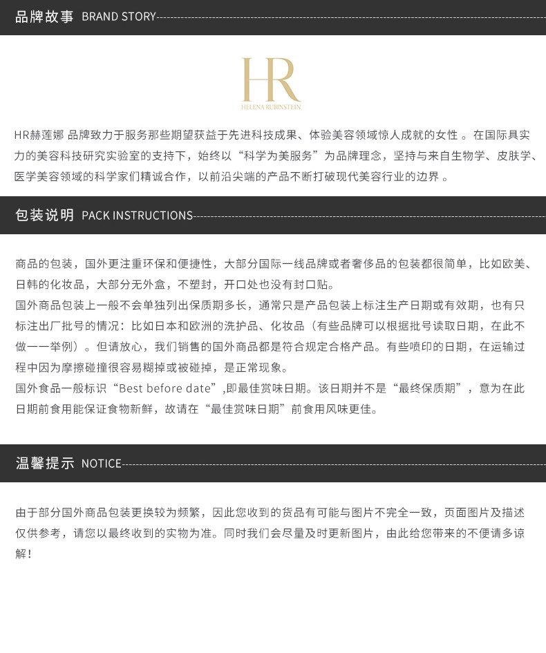 HR赫莲娜 (Helena Rubinstein) 是欧莱雅集团旗下的顶级奢华美容品牌,也是现代美容行业的奠基品牌之一。HR赫莲娜严格遵守“严谨、科学、艺术、哲学、女性”的品牌内涵,同时不断创新,首次创造许多前卫大胆的作风,而成为美容品牌中的胜出者。