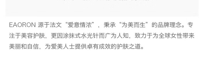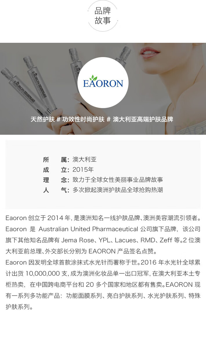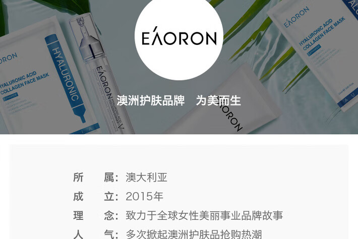 eaoron是澳大利亚的中高档护肤品牌,主要生产适合大部分肌肤使用的护肤品,它家产品天然无添加,敏感肌和孕妇肌也可以安心使用。eaoron除了面膜的价格贵一些,像水光针、美白精华、面霜等都属于性价比极高的好物。澳洲护肤品是公认的好用,而eaoron在澳洲护肤品界的地位举足轻重,可见它的影响力。