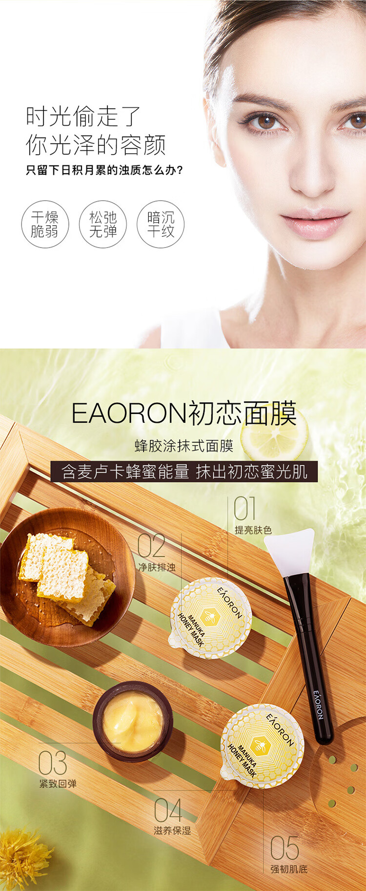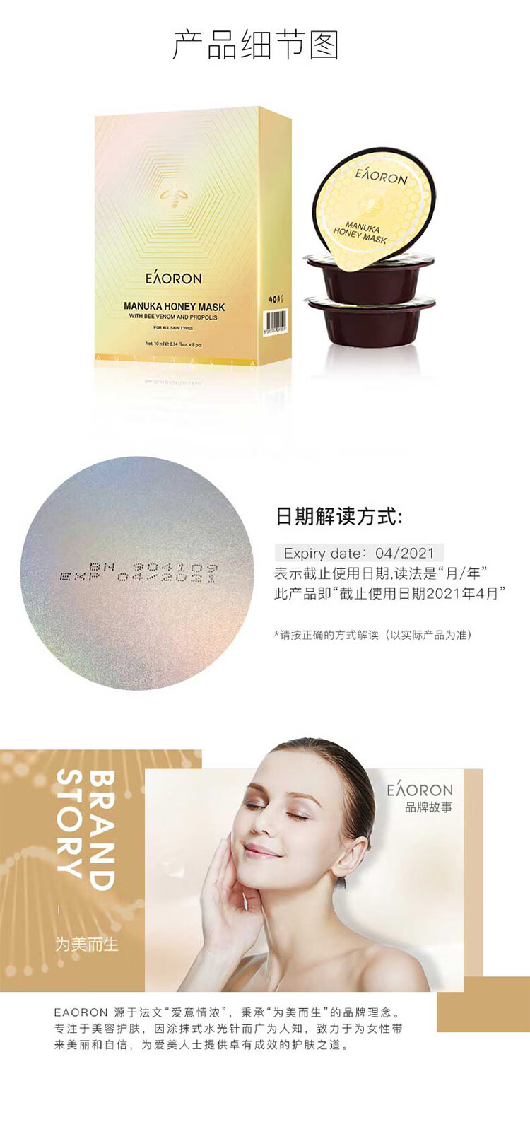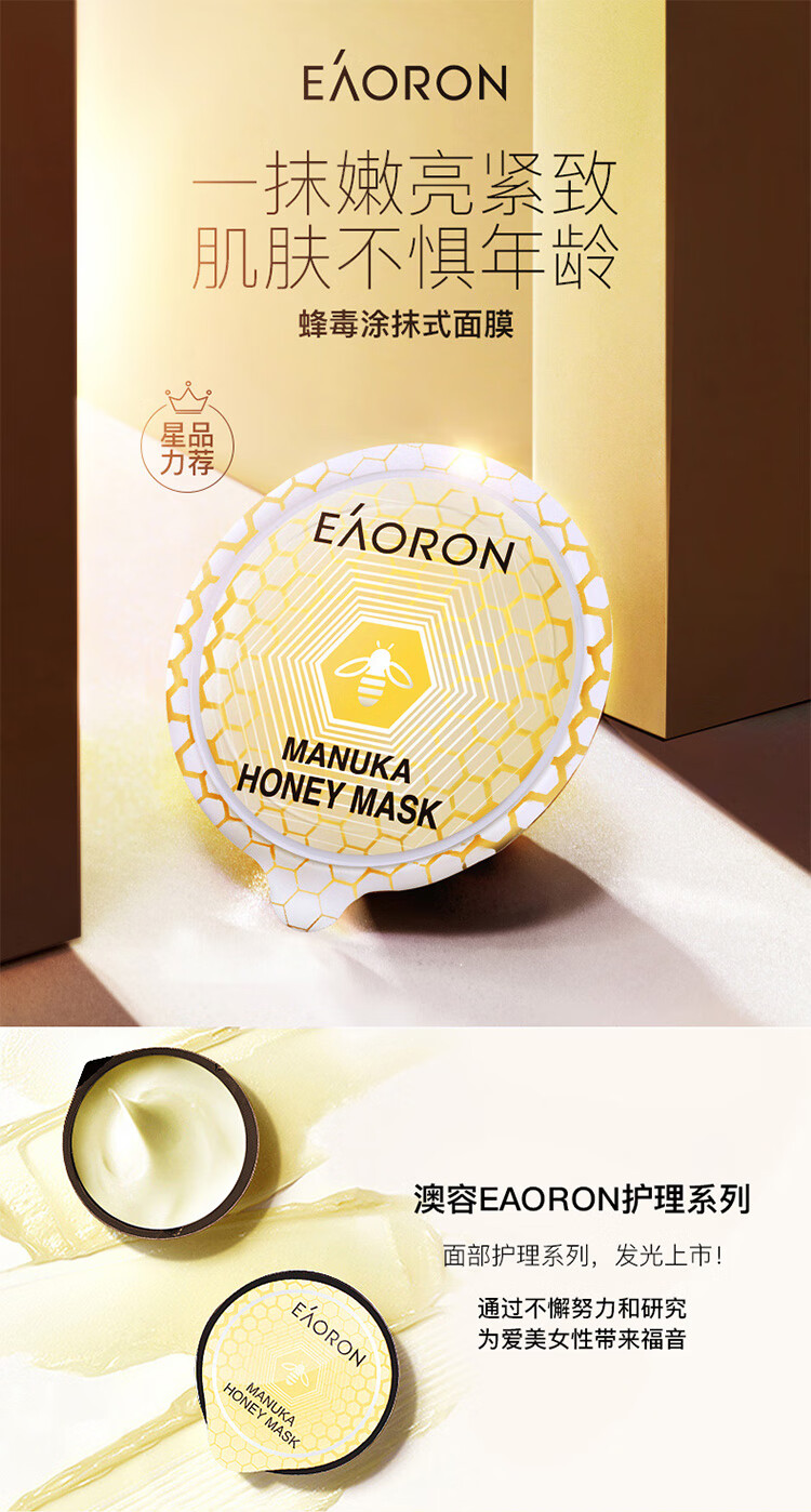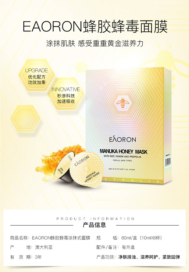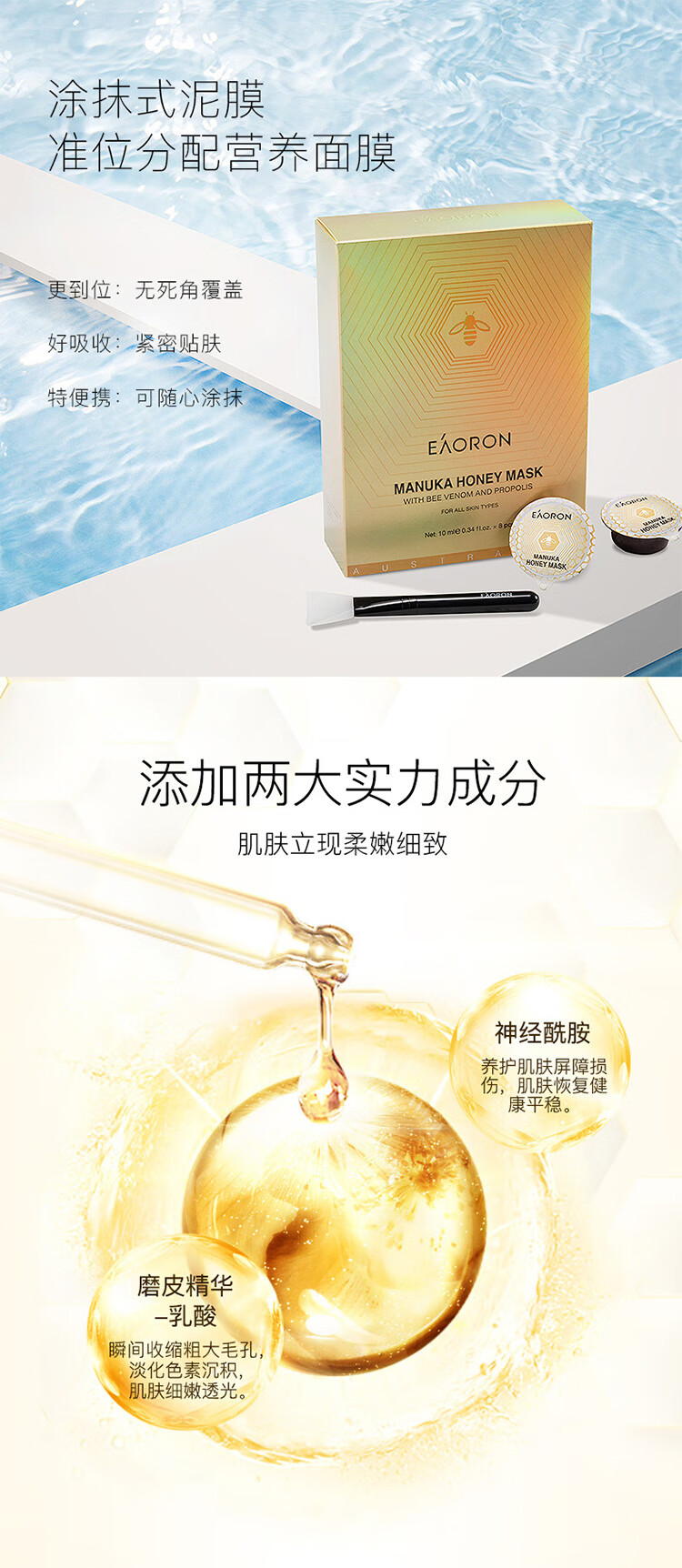 澳洲 进口 EAORON 蜂毒蜂胶面膜 修护受损、保湿滋润、嫩白透亮、收敛毛孔,独立胶囊包装易携带、医用硅胶面膜刷安全亲肤、蜂蜜成分提亮嫩白、蜂毒成分紧致肌肤。