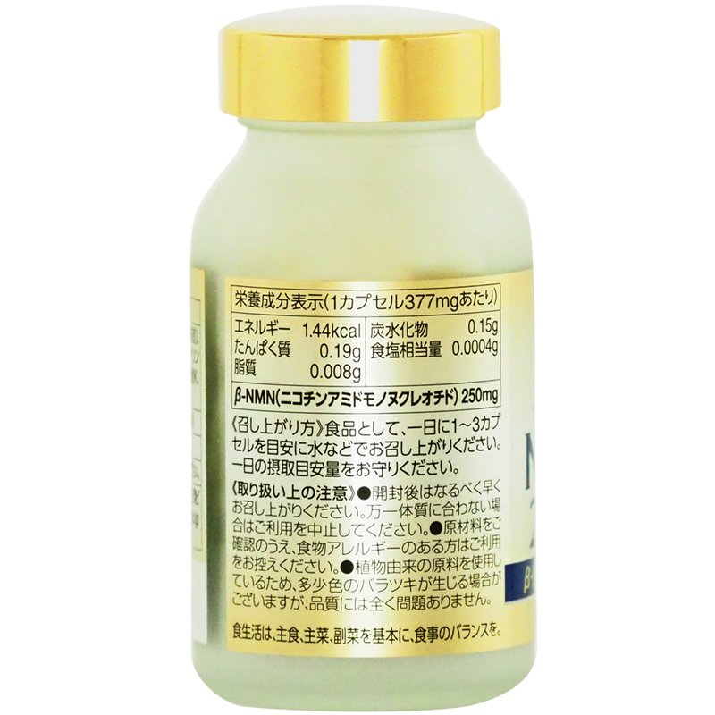 | 营养成分(每天 3 粒) 能量1.44kcal 蛋白质0.19克 脂肪 0.008g 碳水化合物 0.15g 盐当量0.0004g β-NMN(烟酰胺单核苷酸)250mg |