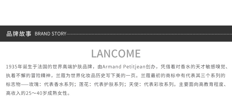 兰蔻1935年诞生于法国,是由Armand Petitjean(阿曼达·珀蒂让)创办的品牌。作为全球知名的高端化妆品品牌,兰蔻涉足护肤、彩妆、香水等多个产品领域,主要面向教育程度、收入水平较高,年龄在25~40岁的成熟女性 。2018年12月,世界品牌实验室发布《2018世界品牌500强》榜单,兰蔻排名第494。