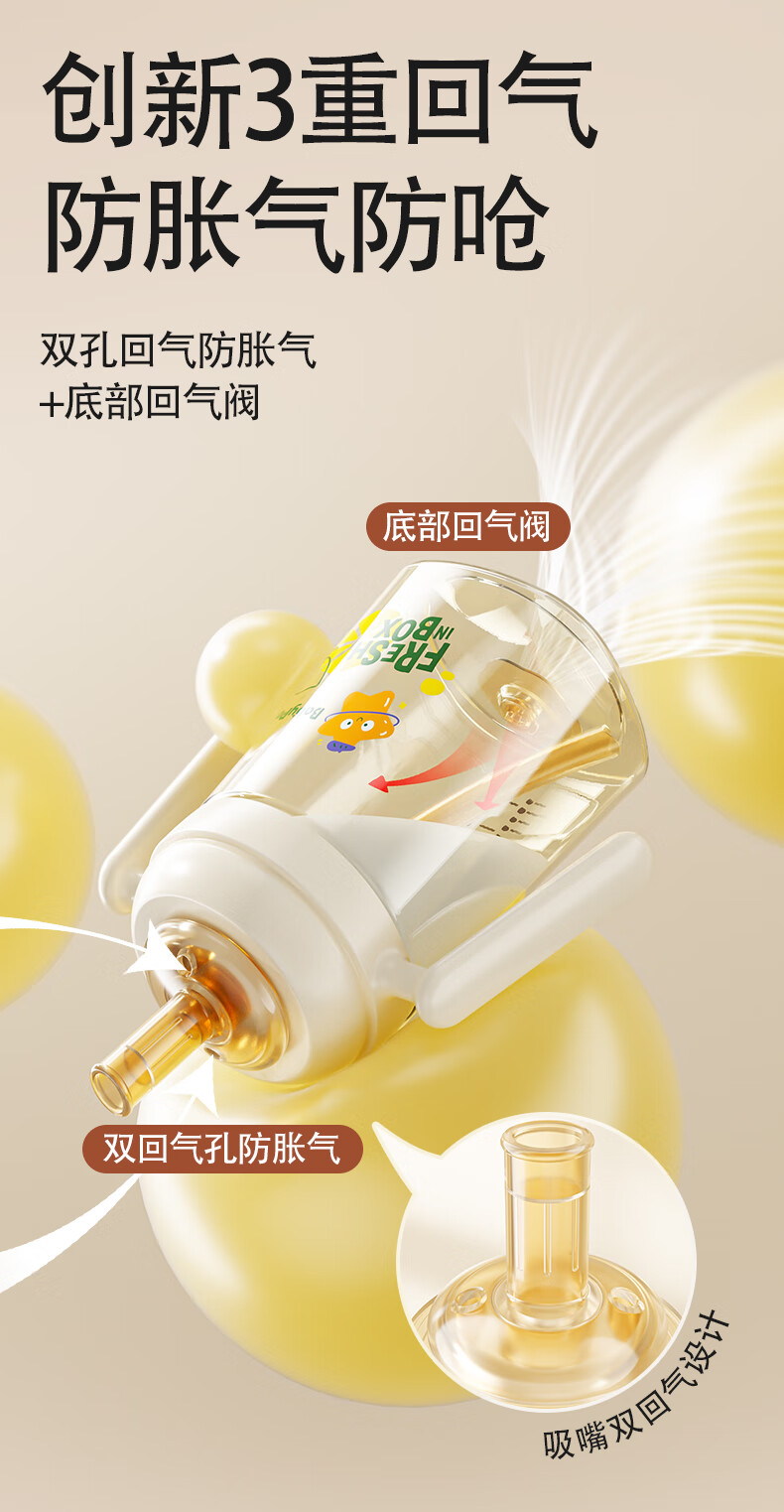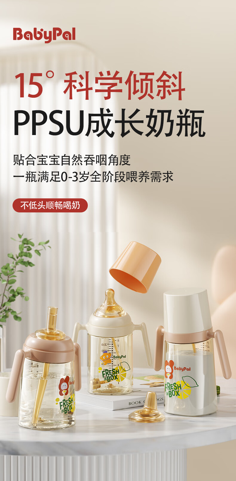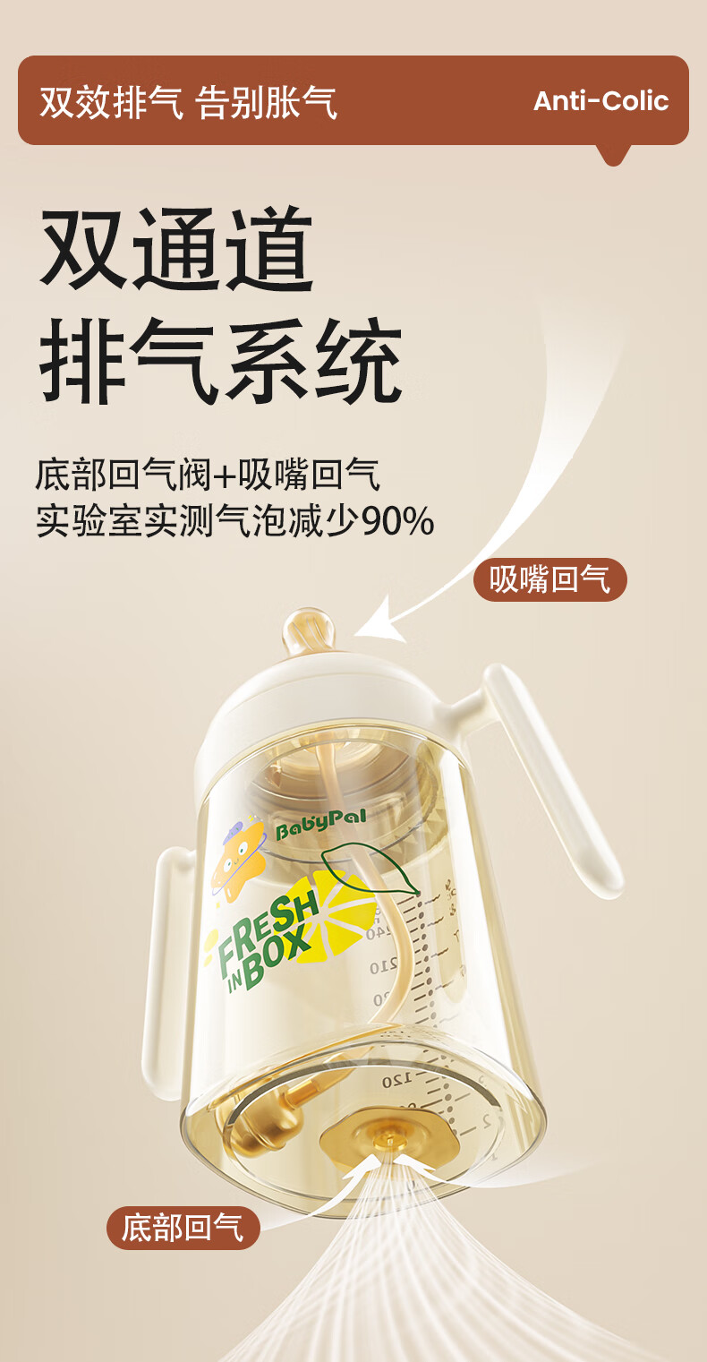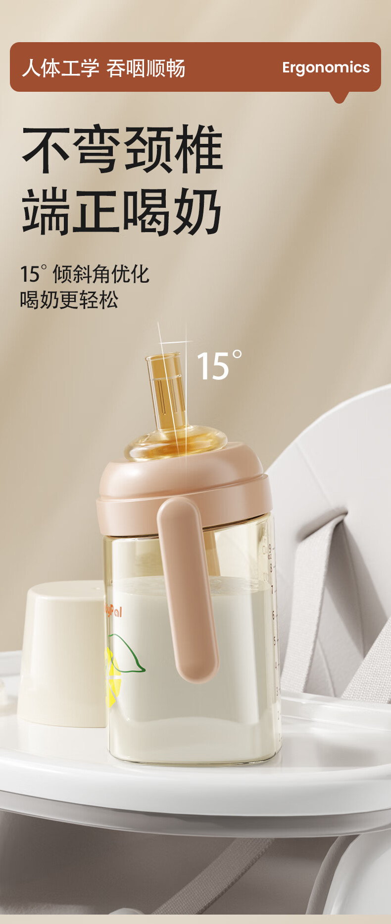 底部回气ppsu倾斜奶瓶,15°科学倾斜成长奶瓶,一瓶满足0-3岁全阶段喂养需求,不低头顺畅喝奶,40°感温变色刻度,双通道排气系统,创新三重回气防胀气防呛真空吸附终结者,底部回气科学防胀气