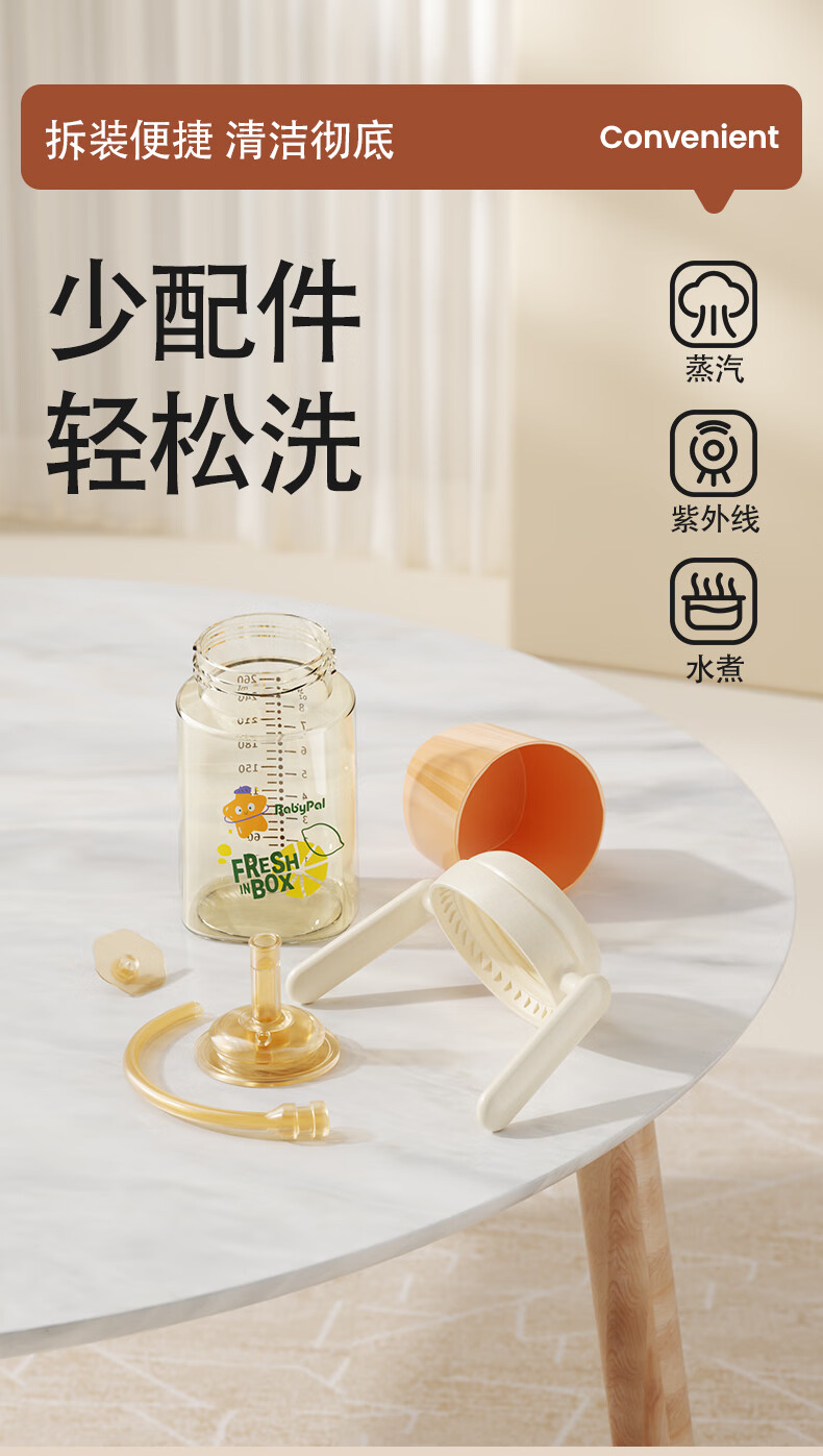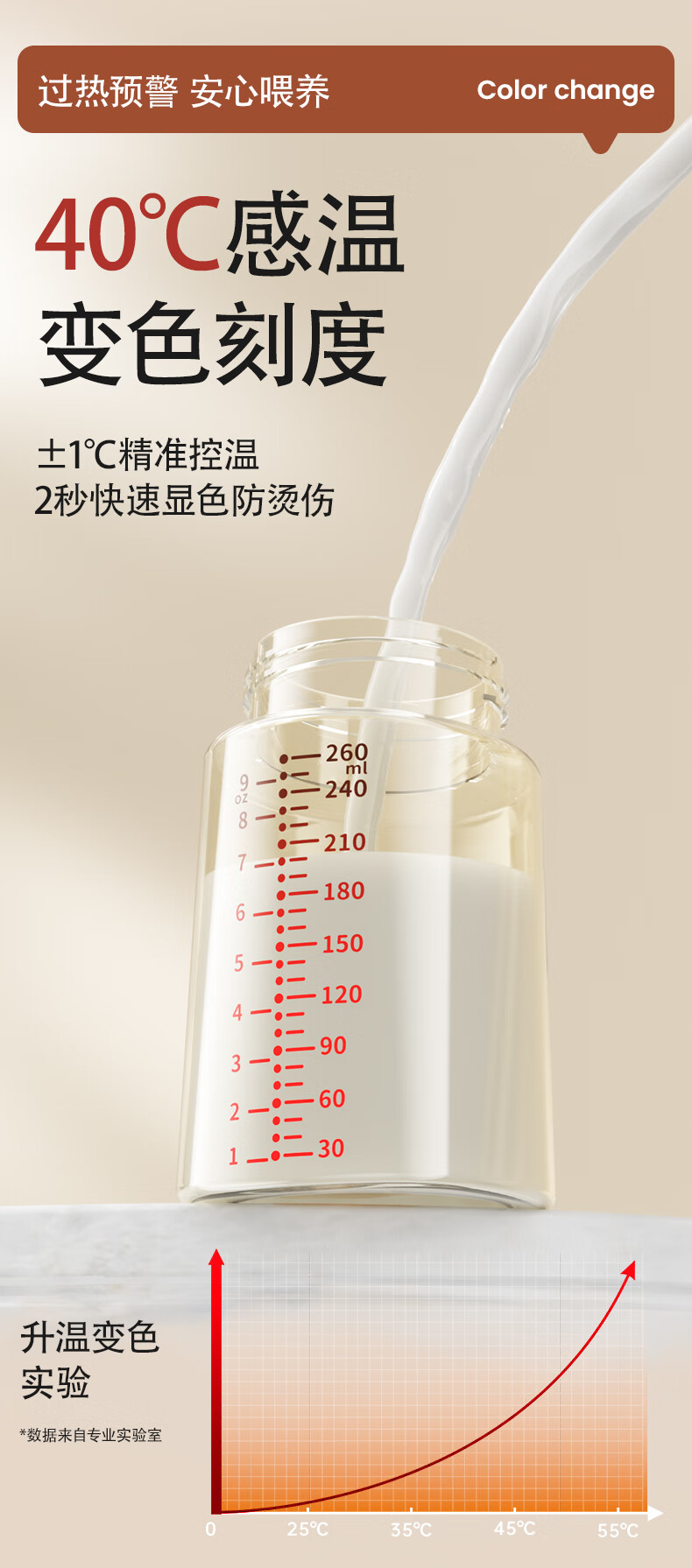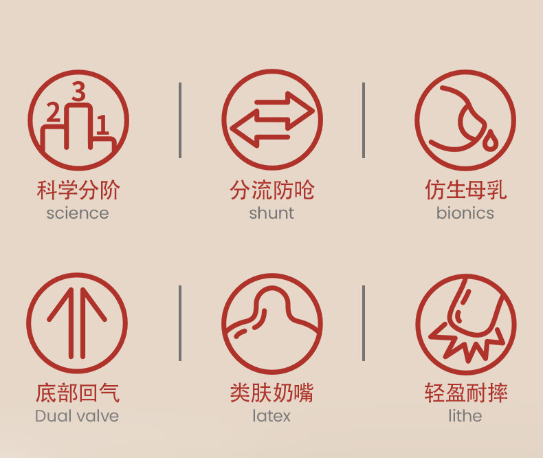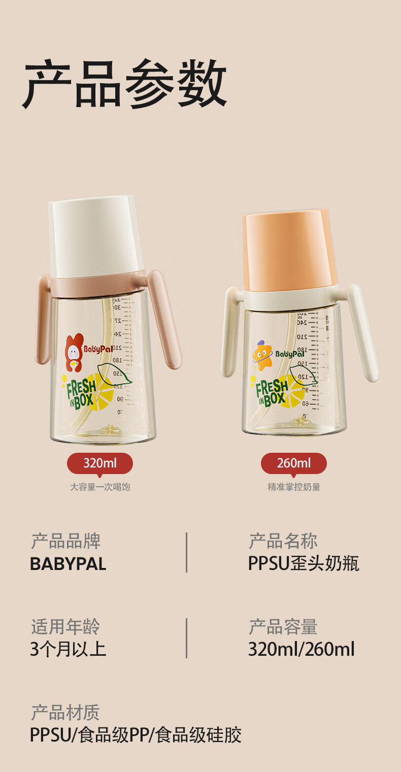底部回气ppsu倾斜奶瓶,15°科学倾斜成长奶瓶,一瓶满足0-3岁全阶段喂养需求,不低头顺畅喝奶,40°感温变色刻度,双通道排气系统,创新三重回气防胀气防呛真空吸附终结者,底部回气科学防胀气