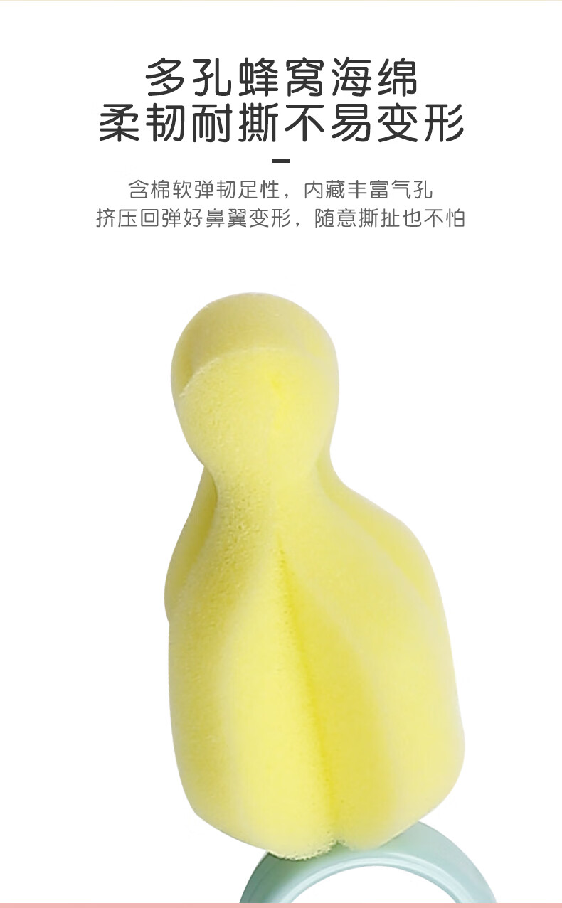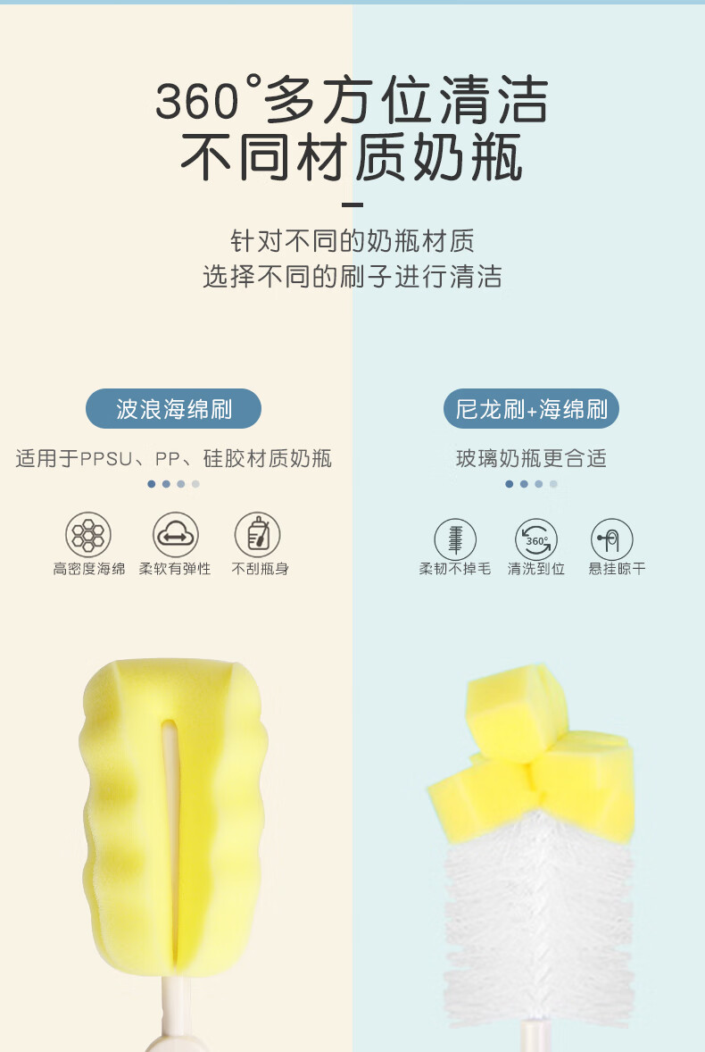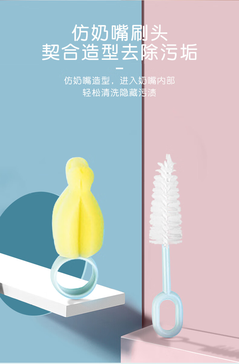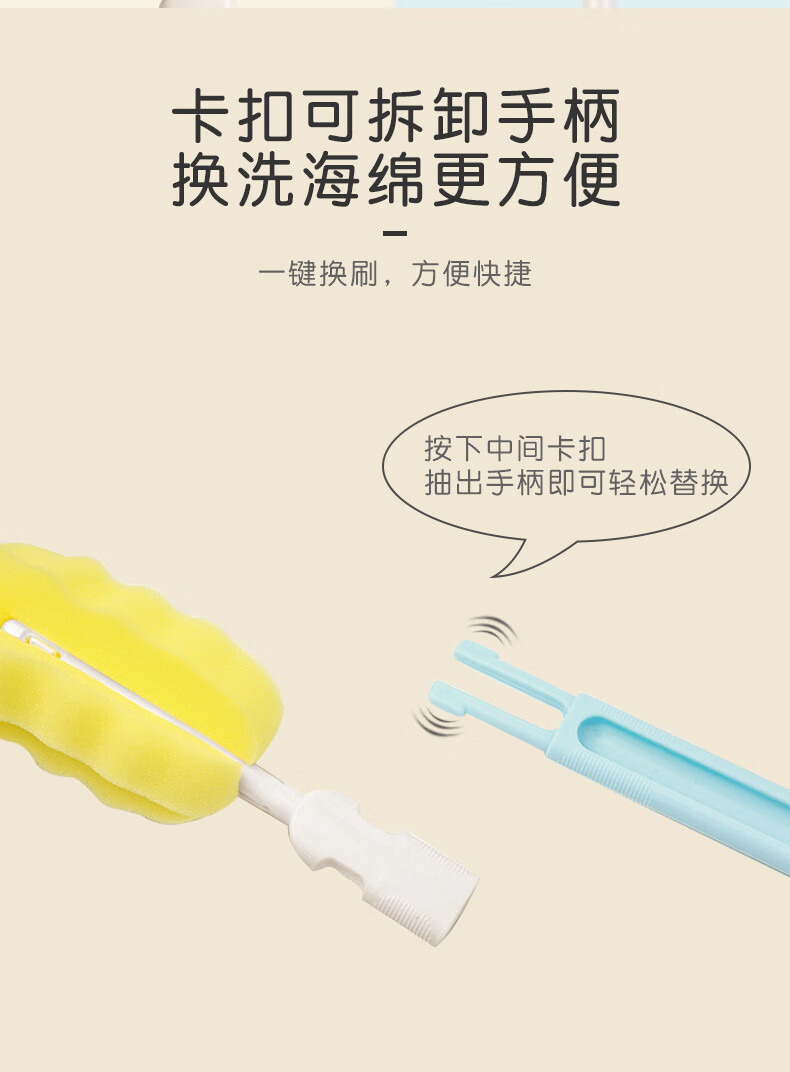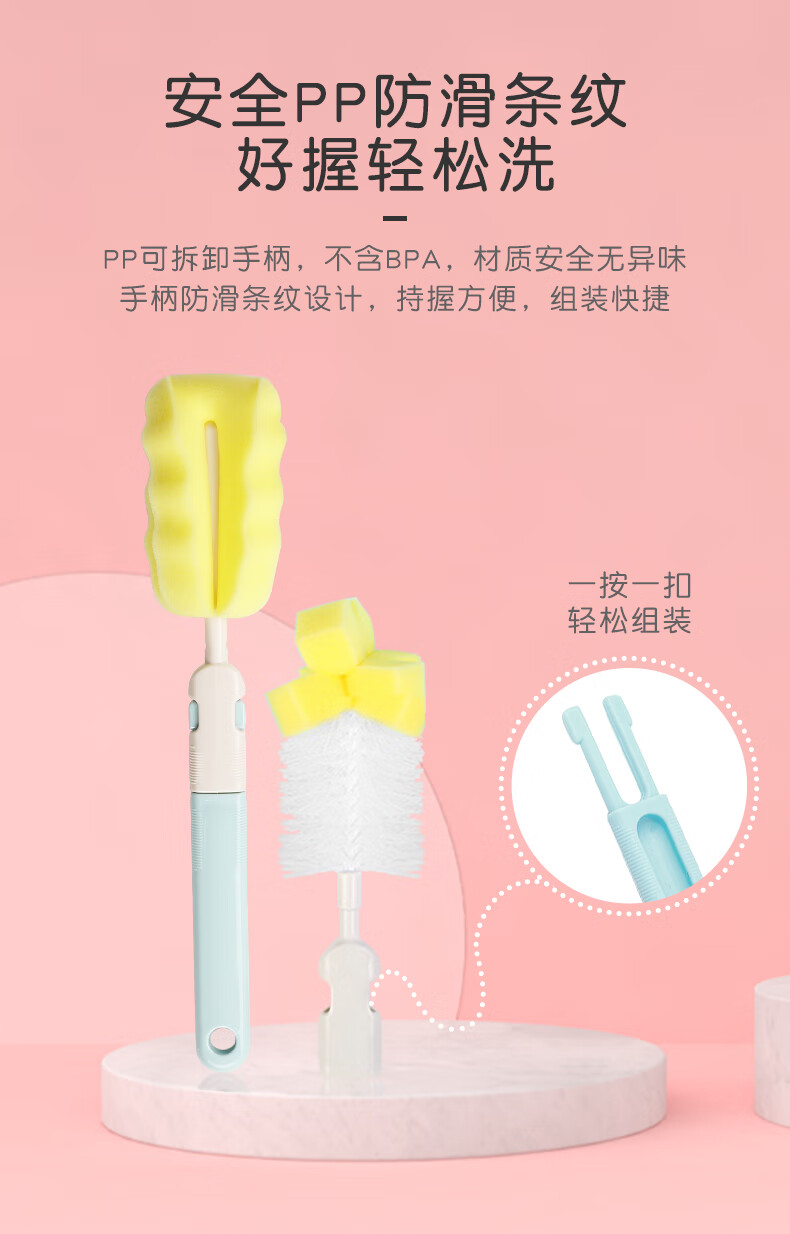 360度无死角清洁,多种有效刷头,深层清洁奶瓶。卡扣可拆卸手柄,换洗更方便。多孔蜂窝海绵,柔韧耐撕不易变形。安全PP材质,手柄条纹更好握持。
