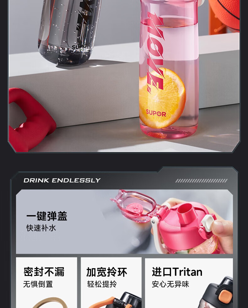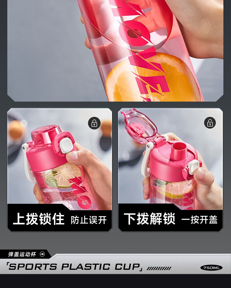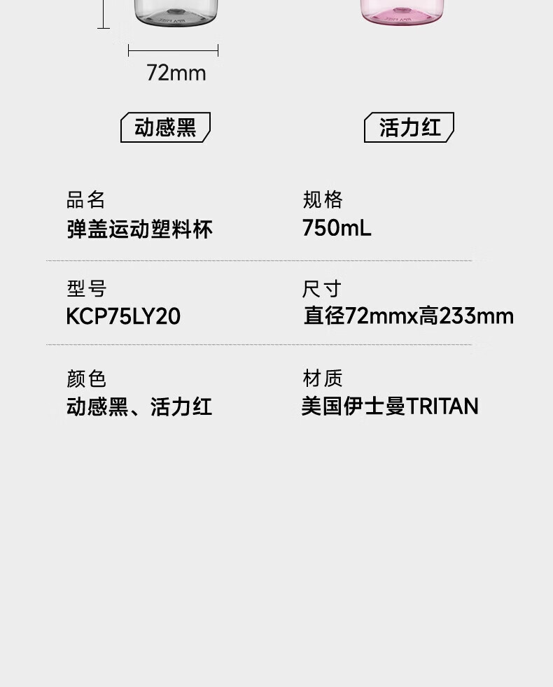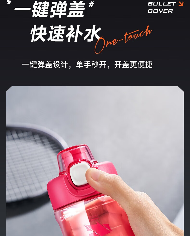 "安全:美国FDA认可Tritan材质,不含双酚A 便捷:一键开盖,随时随心畅饮无阻 强韧:耐摔打挤压,不易老化脆裂"