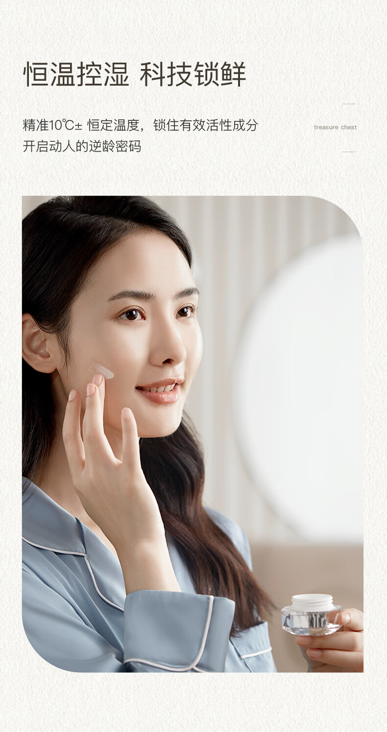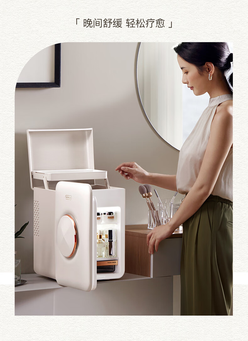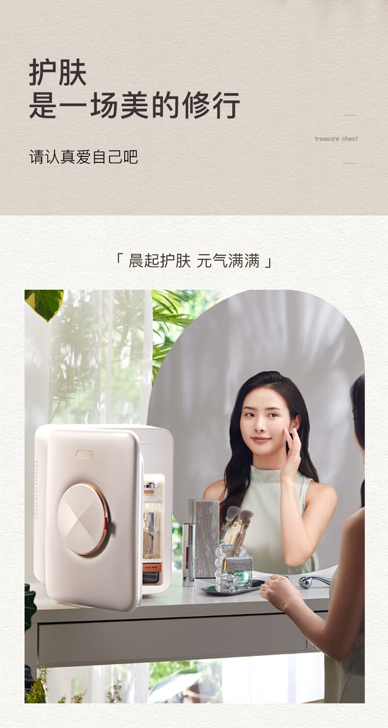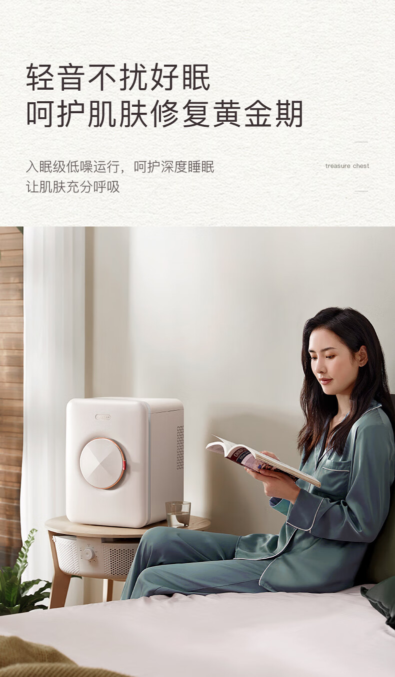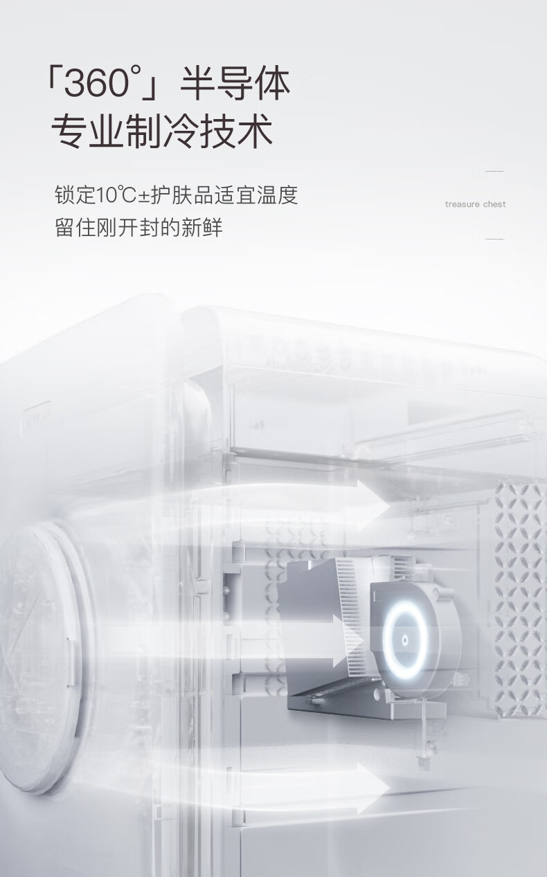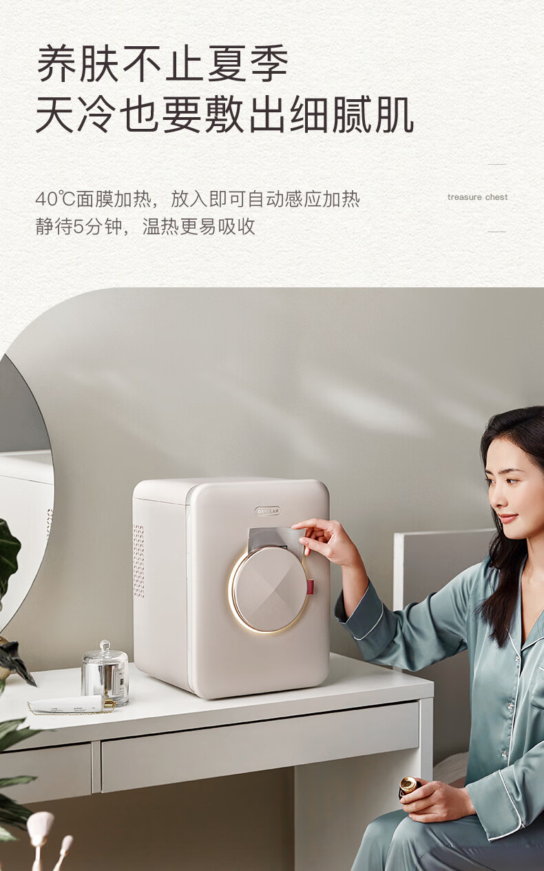 "1、桌面放置,玲珑小巧,内部魔术空间自由组合,更易存放各类美妆产品; 2、智能风冷循环,恒温保鲜10℃(室温25℃状态),有效抑菌不结霜,创造最适合护肤品保存的温度环境; 3、创新智能面膜加热仓,放入面膜后自动加热至40℃,激活冷藏的面膜营养活性,又不破坏有效成份,促进面部吸收营养成分。面膜加热板可旋转打开,加热体积更小的眼贴等,并方便清洁灰尘; 4、采用半导体制冷方案,区别于普通的压缩机制冷,31db入眠级静音,更适宜卧室与化妆台摆放。"