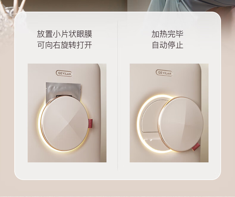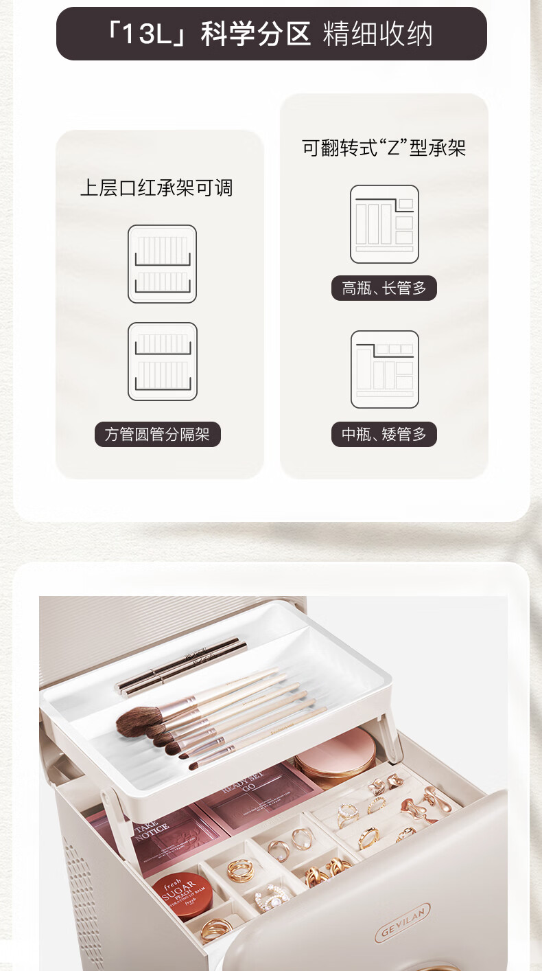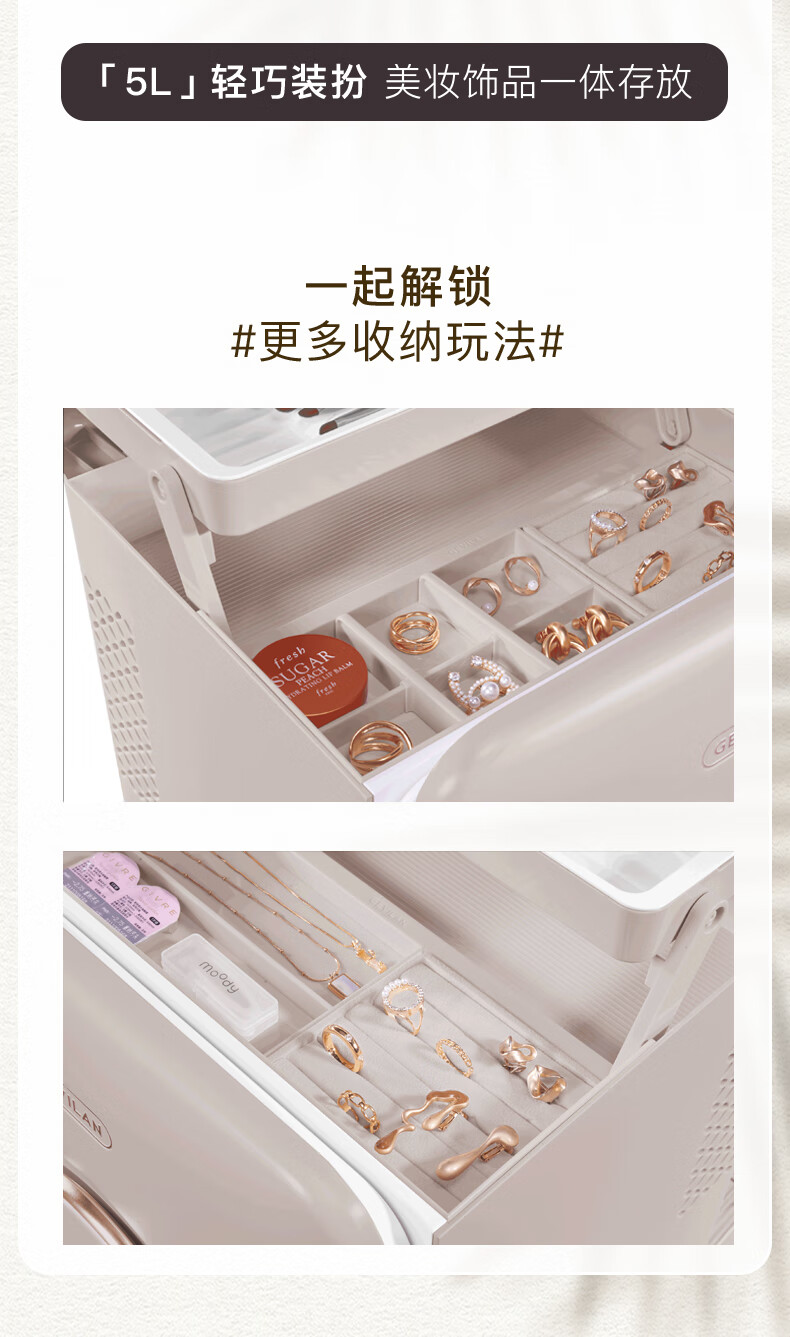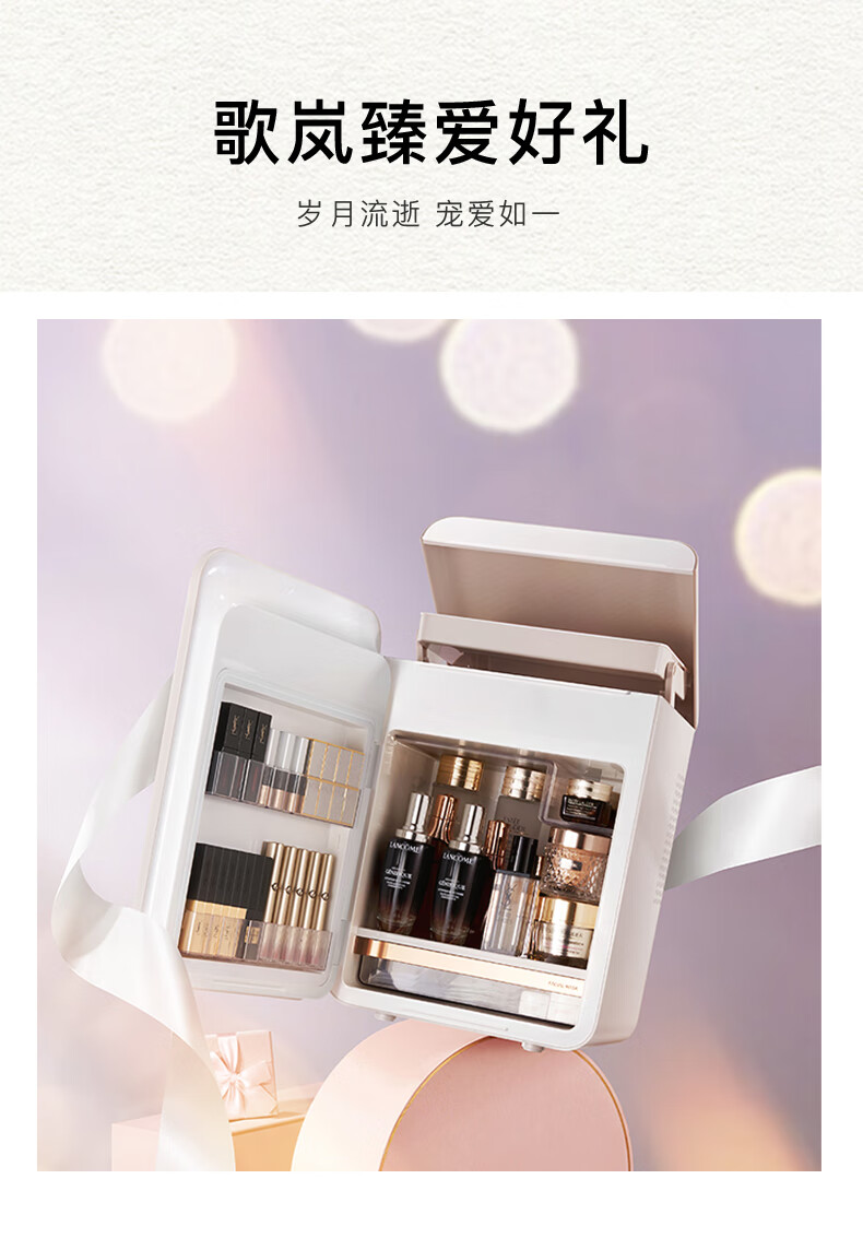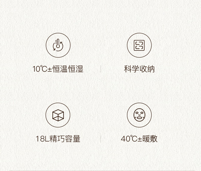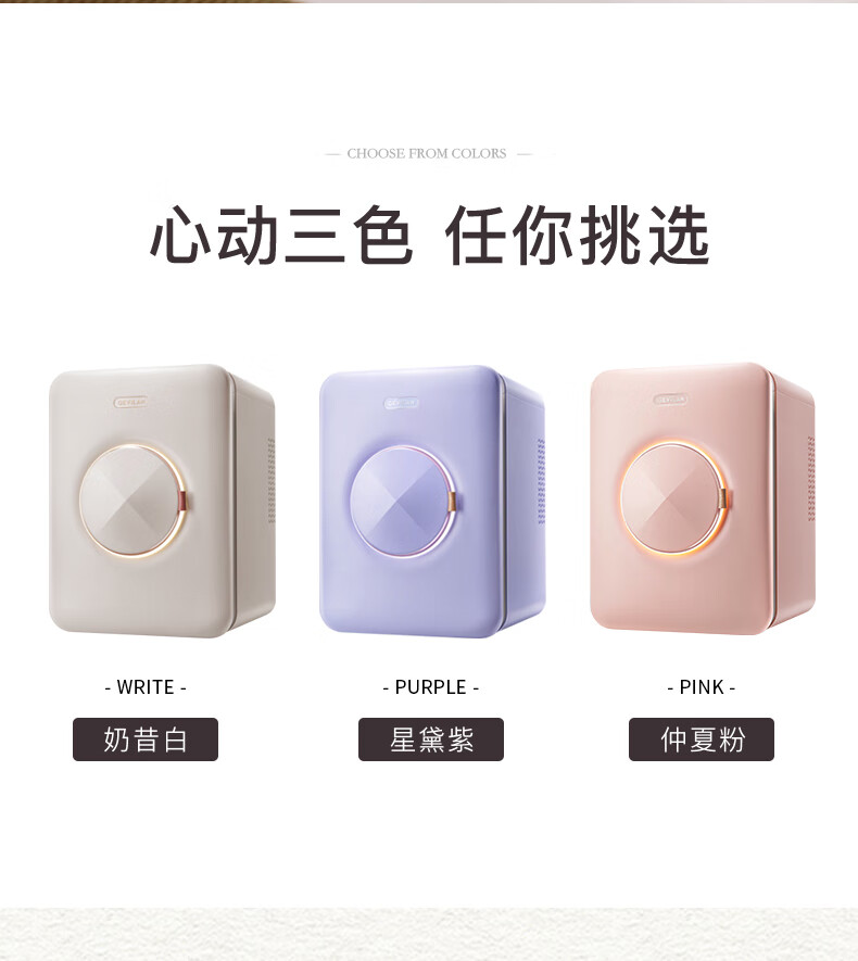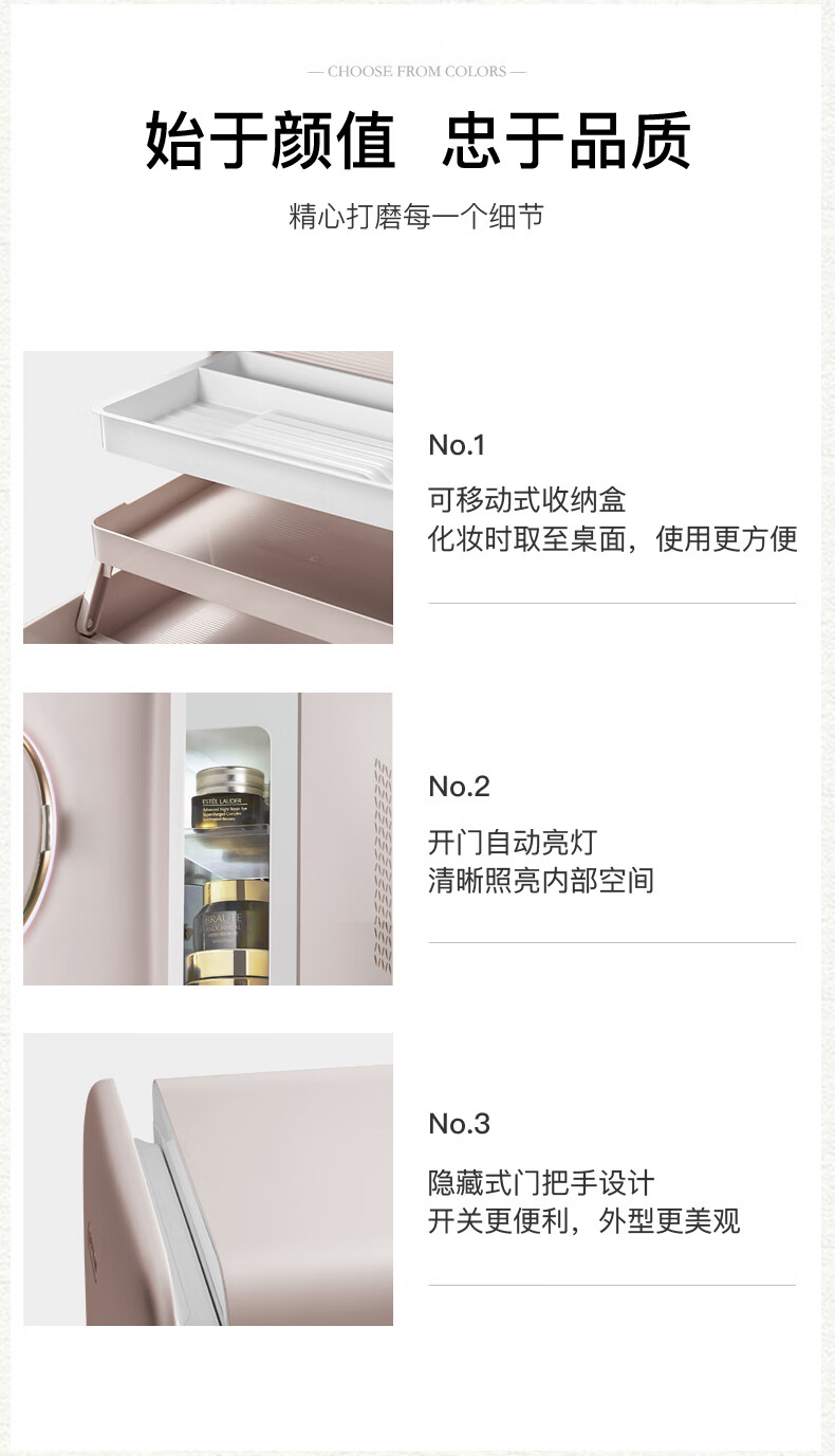 "1、桌面放置,玲珑小巧,内部魔术空间自由组合,更易存放各类美妆产品; 2、智能风冷循环,恒温保鲜10℃(室温25℃状态),有效抑菌不结霜,创造最适合护肤品保存的温度环境; 3、创新智能面膜加热仓,放入面膜后自动加热至40℃,激活冷藏的面膜营养活性,又不破坏有效成份,促进面部吸收营养成分。面膜加热板可旋转打开,加热体积更小的眼贴等,并方便清洁灰尘; 4、采用半导体制冷方案,区别于普通的压缩机制冷,31db入眠级静音,更适宜卧室与化妆台摆放。"