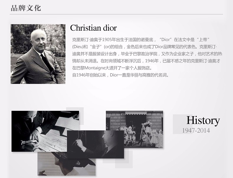 Dior 由法国时装设计师 Christian Dior 创立于1946年,主要经营时装、皮具、珠宝、腕表、香水、化妆品、童装等高档消费品。目前隶属于全球最大奢侈品集团 LVMH 。1948年由“花冠”裙为主打的Dior 第一个时装系列“新风貌”(New Look)引起了巨大轰动。2001年法国籍设计师 Hedi Slimane接手改名后的DIOR HOMME,