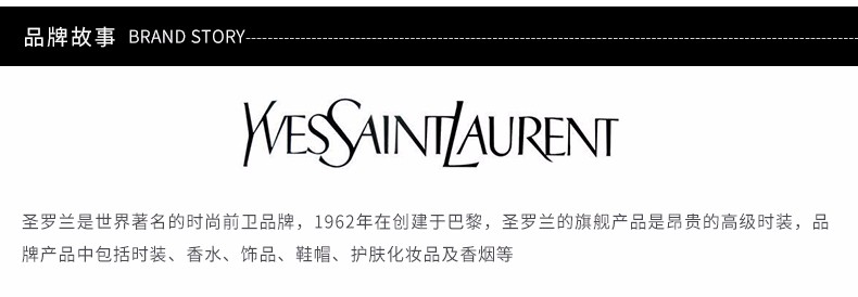 圣罗兰(Yves Saint Laurent),简称YSL,是一个法国著名的奢侈品牌,由Yves Saint Laurent(伊夫·圣·罗兰)和他的伴侣Pierre Berge(皮埃尔·贝杰)于1962年在巴黎创立。该品牌的产品线包括护肤品、香水、男女士成衣、皮具、鞋履、珠宝、化妆品、眼镜和配饰等。圣罗兰的品牌理念强调时装不仅是为了让女性更美,而是要在精神上支持她们,让她们变得更自信。品牌的形象标识由Y、S、L三个大写英文字母叠加而成,具有很高的辨识度。