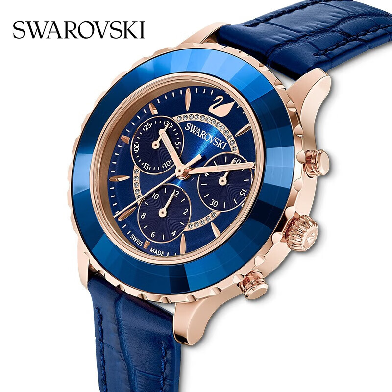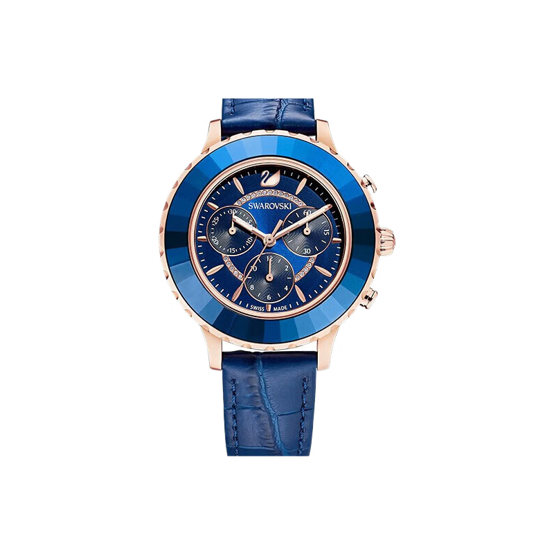 Octea Lux Chrono 堪称手表制作及水晶工艺的标志性设计 这款腕表采用潮流配色 璀璨亮眼 闪闪动人 不锈钢表壳为施华洛世奇专属的水晶边框增添动感背景 炫目的单宁蓝微光闪烁 表盘与意大利小牛皮鳄鱼纹表带相得益彰 共同成就其夺目外观 这款摩登计时器配备三个表盘 12 点钟位置缀以施华洛世奇天鹅...