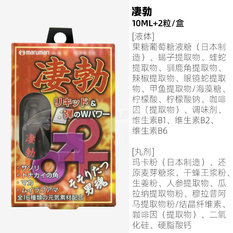 豆油,-包含E植物油,甲鱼提取物(Toriorin OP),驯鹿角粉末,海狗肉粉,Uanarupomacho粉,甲鱼炭化粉末,L-瓜氨酸,含有锌的酵母,冬虫夏草提取物,Makaekisu粉,瓜提取物,海马粉末维生素,蝎粉末,Akagaukuruwa端,eurycoma长提取物粉末,明胶,蜂蜡,甘油脂肪酸酯,血红素铁,维生素B1,(大豆来源)植物卵磷脂 |