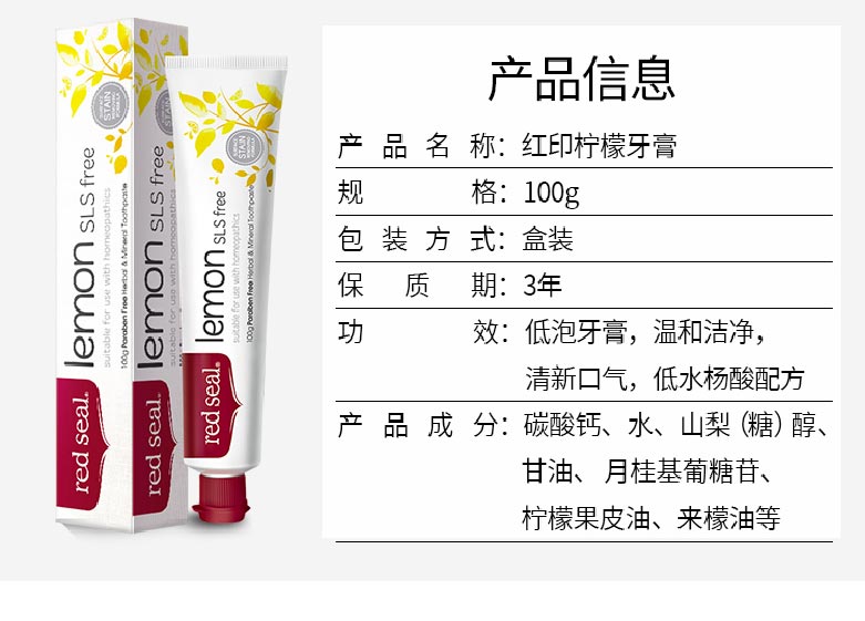 【精品推荐】新西兰Red Seal红印柠檬味清新口气牙膏100g