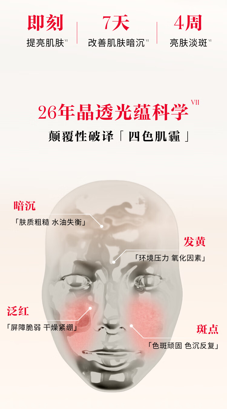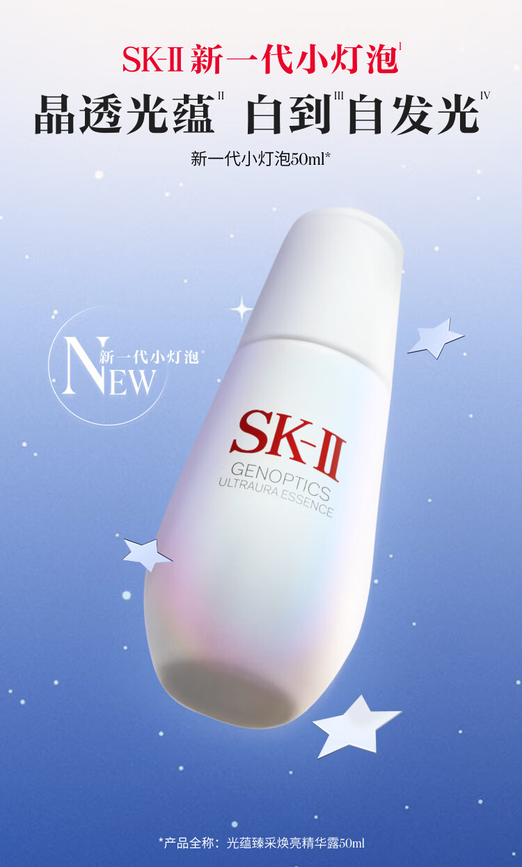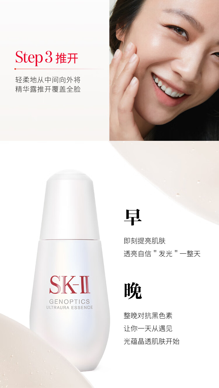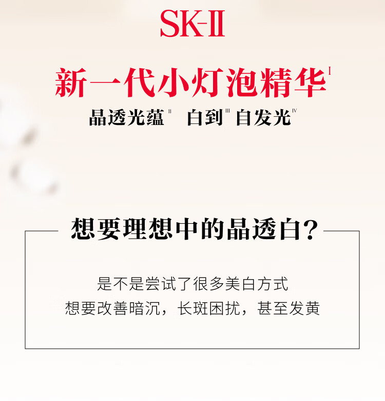 日本SKII环采臻白精华露新加入Pixel White成份,有效抑制压力受体,从细胞层面改善肤质及肤色不均问题。配合De-MelanoP3C的环采钻白复方,能有效抑制黑色素的传递及形成。白到发光的小灯泡。从早的小银瓶时代到环彩,小灯泡全新升级版,富含pitera,通过光蕴肌因科技,直达肌底,祛除肌底灰霾,使肌肤耀绽通透光感。添加了淡斑精华,晒斑、暗沉、肤色不均可以一举多得。