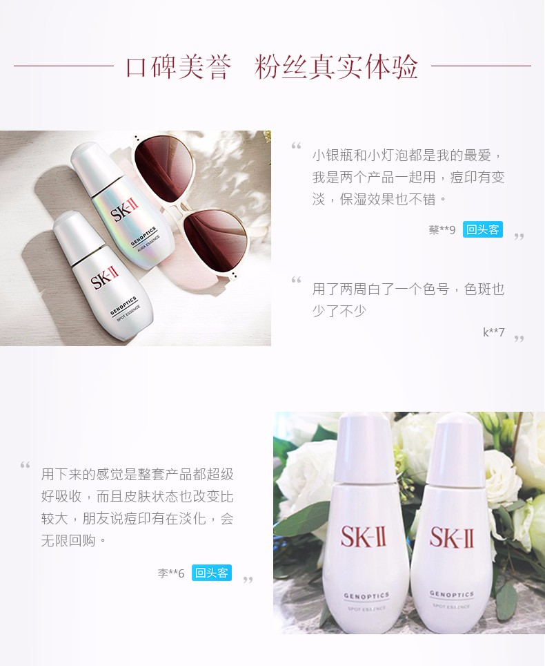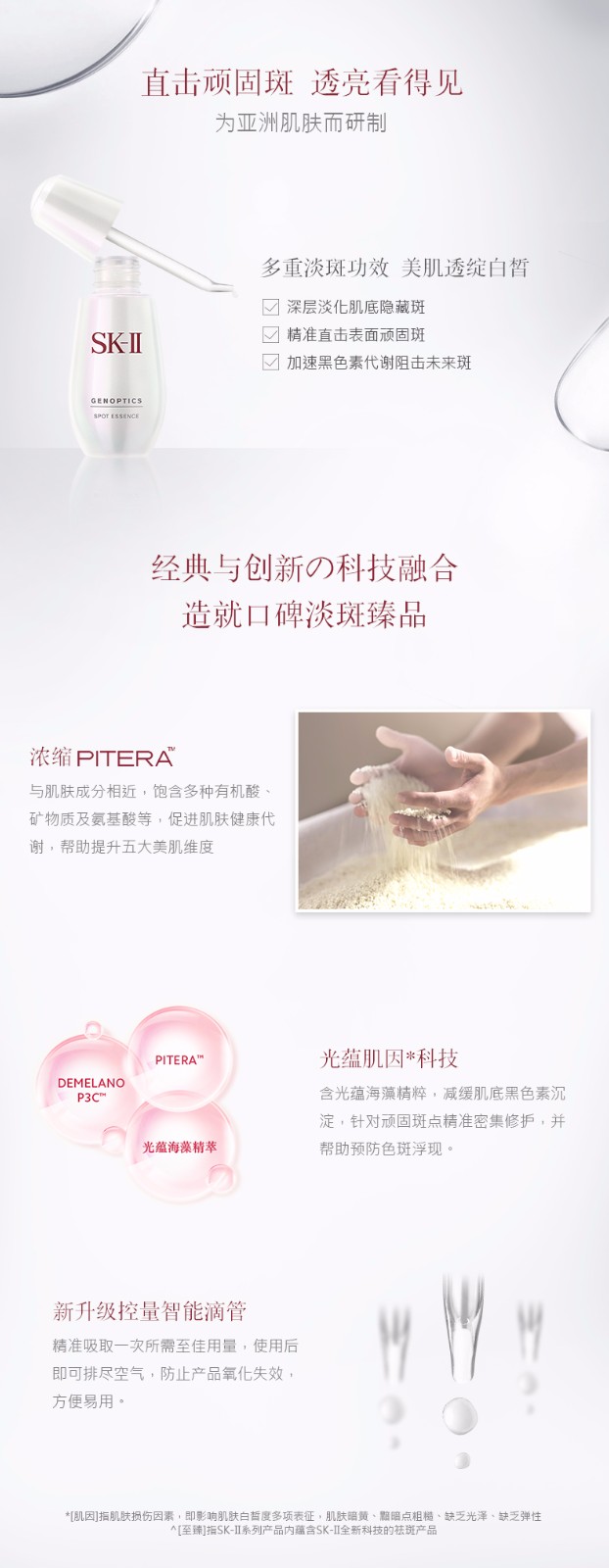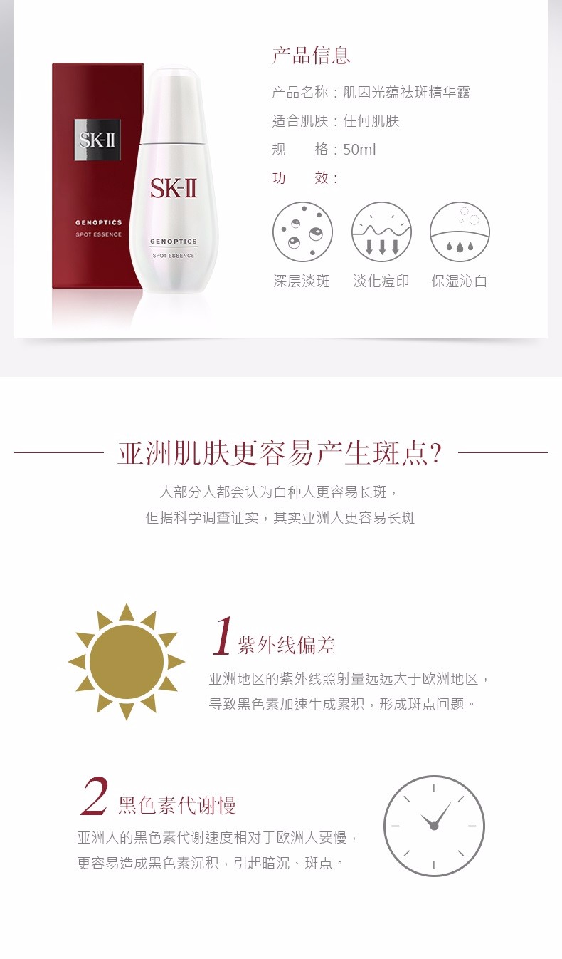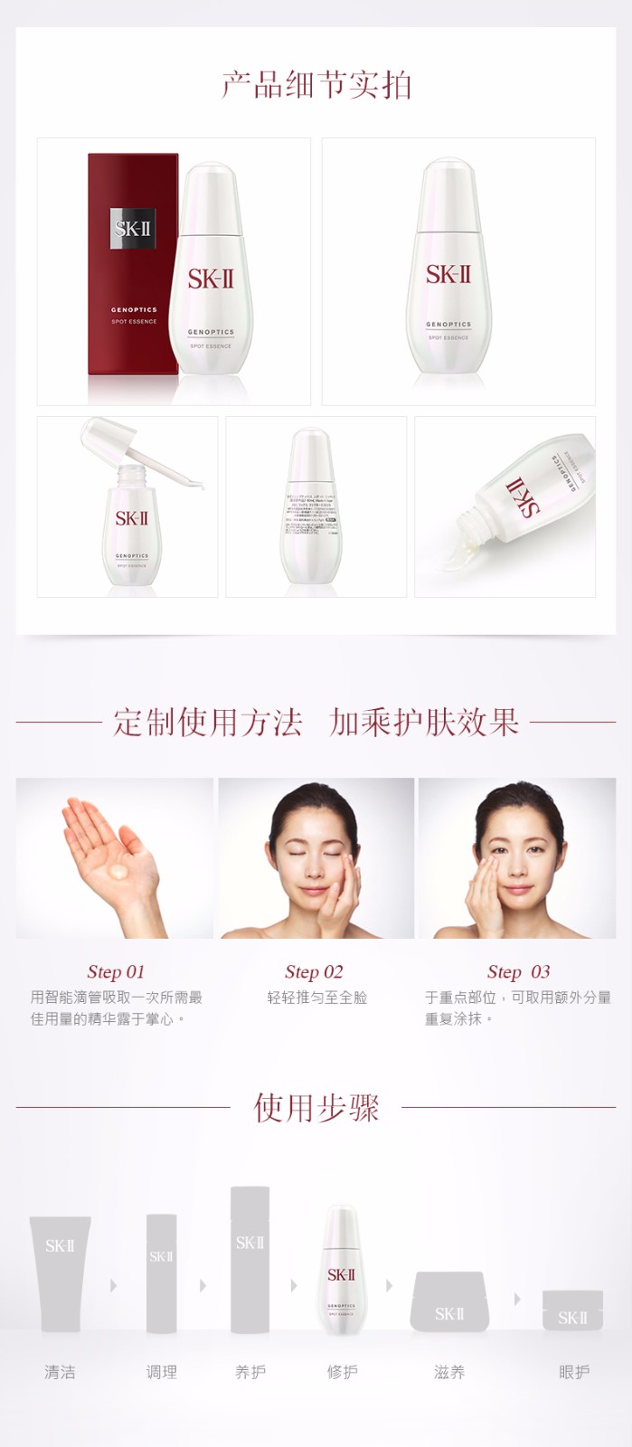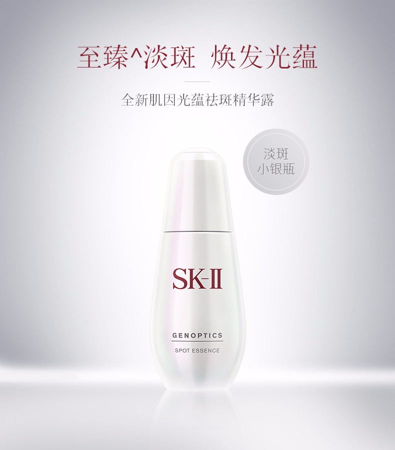 SK-II护肤精华露,维持肌肤均衡,为全球女性带来无数护肤奇迹!我们都知道它还有个“神仙水”的美誉,年龄隐秘者! 所有的SK-II 产品均含有Pitera这一神奇的成分,是每个SK-II护肤过程的“核心”所在,而护肤精华露内含超过90%的纯Pitera!推进肌肤天然的28天表皮新生过程,恢复至关重要的肌肤平衡;维他命、氨基酸、矿物质和有机酸的简单混合实现了面容的奇迹再生。轻轻一抹,瞬间吸收!一瓶提升五大美肌需求,专注亚洲女性护肤需求,能够看得见效果的提升肌肤光泽度、细腻度、紧致度、白皙度、抗皱度!肌肤遇见神仙水,愈见晶莹剔透~就像女神汤唯说的,“几年前对皮肤的未来不太乐观,还好遇到了它,帮肌肤改变了命运”。越早用神仙水,锁住你年轻肌肤越长!拥有它,你才知道它的好~日本SKII环采臻白精华露新加入Pixel White成份,有效抑制压力受体,从细胞层面改善肤质及肤色不均问题。配合De-MelanoP3C的环采钻白复方,能有效抑制黑色素的传递及形成。