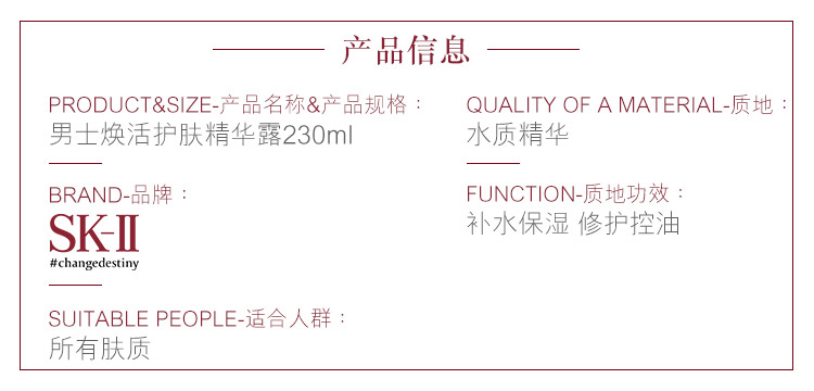 SK-II推出的这款男士焕活护肤精华露,磨砂瓶身独具质感。含有为男性专门配制的独特缓释清凉成分,将焕活护肤精华露轻怕于面部吸收后,独特成分能从肌底释放清凉因子,为肌肤带来无油清爽感受。富含90%以上Pitera酵母精华,帮助调理肌肤,达到水油平衡。