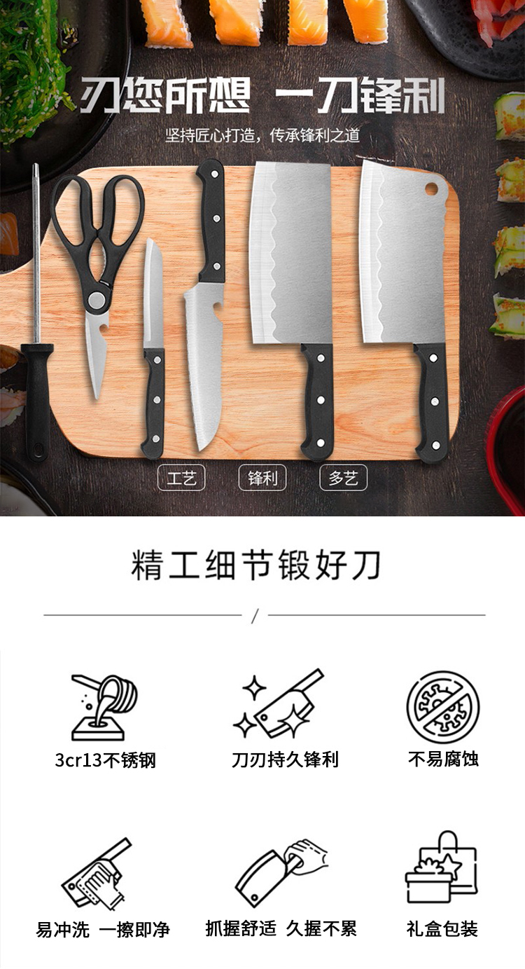 张小泉 银鹭系列不锈钢套装刀具七件套 斩骨刀切片刀厨刀菜刀D30970100
