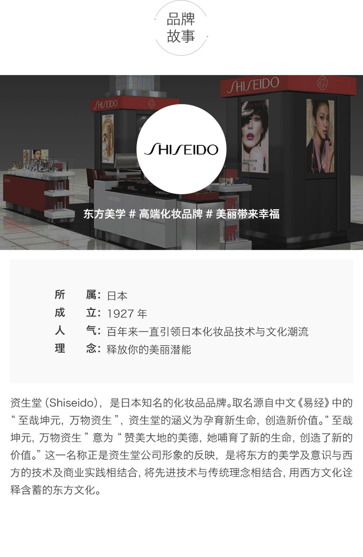 资生堂(Shiseido ),是日本著名的化妆品品牌,品牌秉承了“百年匠心,让美资生”的理念。取名源自中文《易经》中的“至哉坤元,万物资生”,资生堂的涵义为孕育新生命,创造新价值。“至哉坤元,万物资生”意为“赞美大地的美德,她哺育了新的生命,创造了新的价值。”这一名称正是资生堂公司形象的反映,是将东方的美学及意识与西方的技术及商业实践相结合,将先进技术与传统理念相结合,用西方文化诠释含蓄的东方文化。