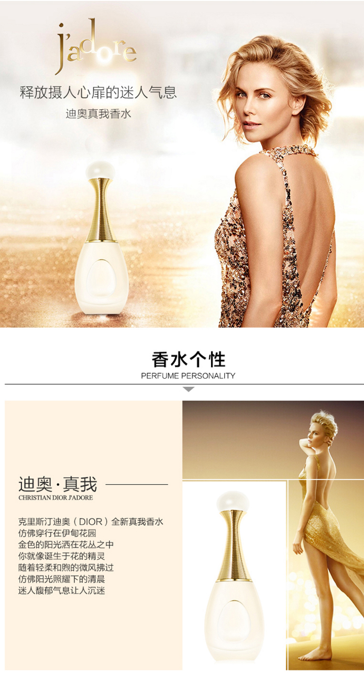 浓淡有致的花果香调,或细语、或呢喃、或大声宣告:真的我,坚强、庄重典雅又始终稳步向前!金色瓶身,细长的瓶颈,瓶身光滑透明没有一点修饰,Jadore这几个字母很美地隐藏在水晶瓶盖上!